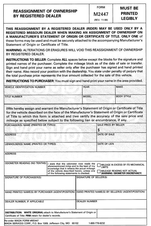This Rider Reassignment Form allows you to make one additional reassignment on a Missouri title, out-of-state title or MSO, when all existing reassignment spaces have been used. Set of 100. (STOCK FORM)